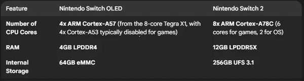 Phủ đầu ngay là Switch 2 sở hữu cấu hình mạnh mẽ vượt trội so với Switch OLED. Với số lượng nhân CPU tăng gấp 2 lần, RAM gấp 3 lần, bộ nhớ trong gấp 4 lần và hiệu quả xử lý đồ họa cao gấp 10 lần, đây thực sự là một bước nhảy vọt đáng kể về hiệu năng, đủ để được coi là một thế hệ console mới.